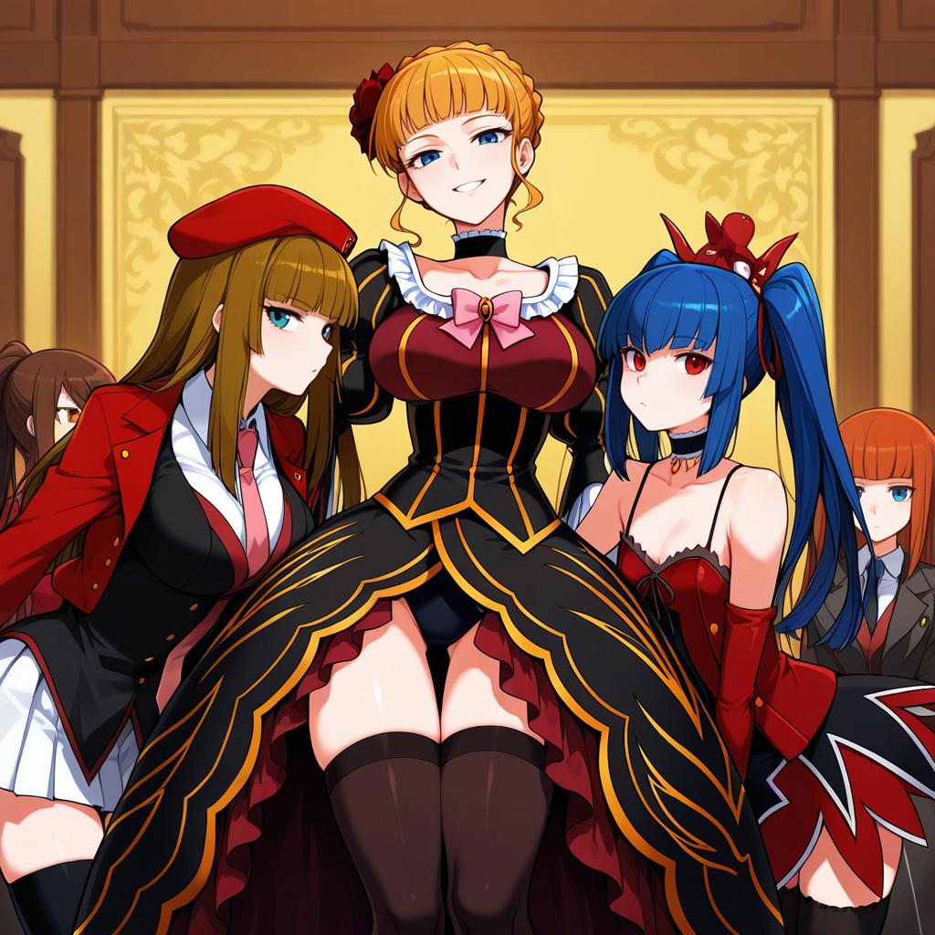 Illustration of a group of female anime characters with diverse hairstyles and expressions gathered indoors. The central figure is a serious young woman with long black hair and blue eyes wearing a form-fitting white and blue outfit. Surrounding her are other characters including a smiling girl with short reddish hair in a light blue top, and additional characters with various hair colors and styles, set against a softly lit room background.