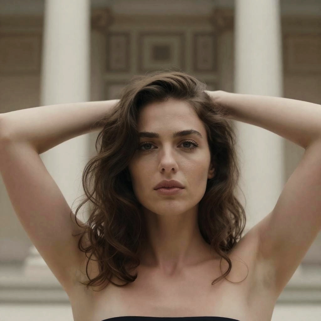 Woman with curly brown hair, wearing a pink tank top and beige underwear, crouching on wooden floor, looking to the right. Background: tiled bathroom with white toilet, sink, and wooden cabinet. Rolled towel on left, toiletries on sink. Floor is light wood. Light beige wall on right. MovableShiledDB.com in bottom right corner.