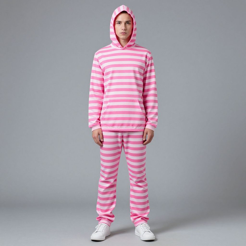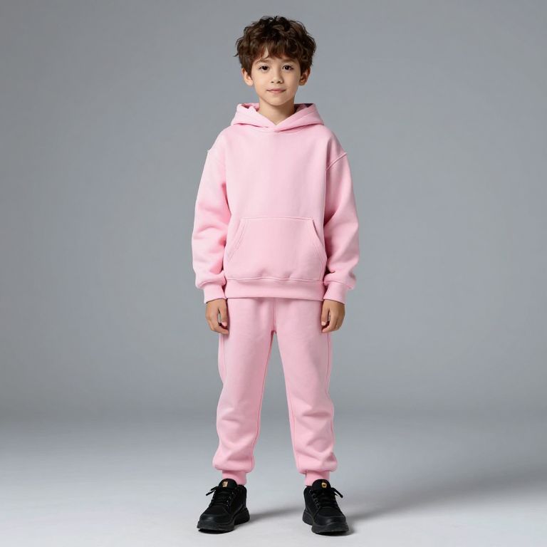 Boy wearing a pink sweat suit with a hoodie and black shoes.