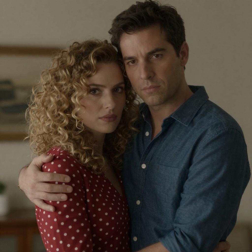 Photograph of a man in a yellow jacket and white shirt, holding a cigarette, standing in a metal cage. A woman with wavy brown hair, wearing a white blouse, reaches through the bars to touch his hand. Brick wall background. Both have intense expressions. Man stands left, woman stands right. Metal cage dominates foreground.