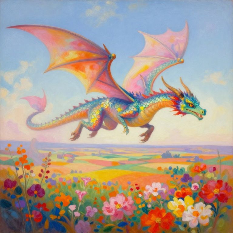 A magnificent mythical creature glides through an autumn sky, its scales reflecting colors reminiscent of a blooming garden. With hues transitioning from soft pastels to bold, saturated tones, the dragon gracefully traverses the canvas. Seen from above expansive fields, this image captures both the awe-inspiring presence of the creature and the serene beauty of nature in a harmonious blend. The artwork invites viewers on an emotional journey, celebrating the power and grace of both the natural world and the realms beyond through vibrant color gradients and evocative strokes that evoke the essence of Georgia O'Keeffe's floral masterpieces.