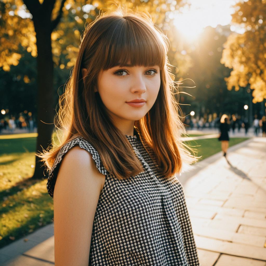Portrait of a teenage boy with a pixie cut hairstyle wearing a sleeveless elegant black dress with white polka dots, standing outdoors in a city park during golden hour with soft sunlight and trees in the background.