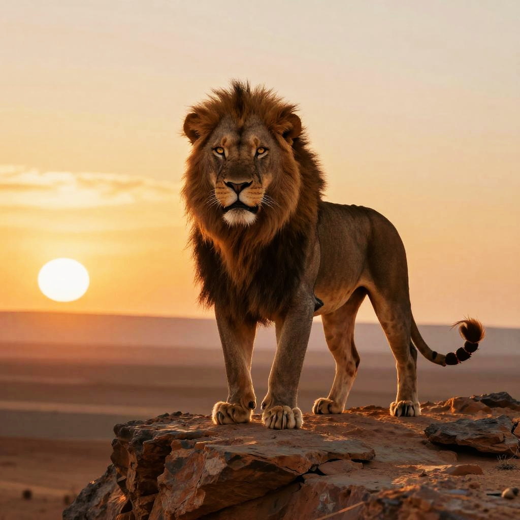 Lion with a scorpion tail resting in a golden savannah under a blood-red moon, bioluminescent markings on tail and body, surreal and mystical atmosphere, high detail