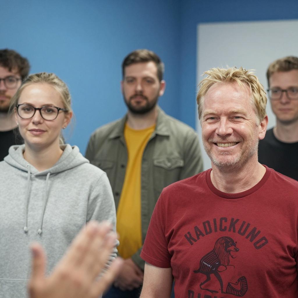 Group photo of six people in a room with blue walls. Blonde man in red shirt with graphic print, smiling, foreground. Blonde woman in glasses, gray hoodie, left. Dark-haired man, green jacket, yellow shirt, center. Other people in background. Out-of-focus hand in foreground. Bright lighting.