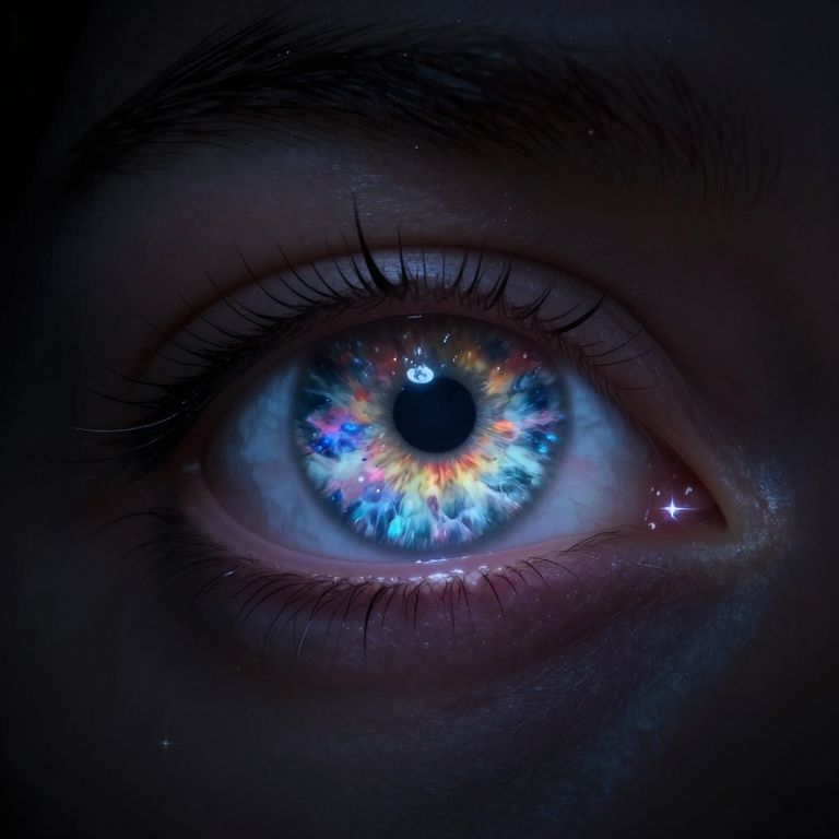 An ethereal eye, its iridescent iris a kaleidoscope of cosmic whispers, opens upon a silent void, inviting introspection into the infinite depths of wonder and mystery.
