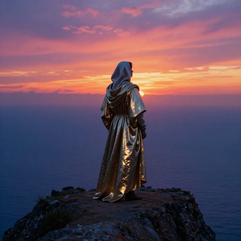 Craft an image reminiscent of Renaissance grandeur, capturing a contemplative atmosphere where a robed figure stands atop a precipice gazing into the vast horizon at sunset. This enigmatic character combines Renaissance attire with contemporary accents; their flowing robe and hood blend seamlessly with sleek, reflective accessories that glint under the golden light of dusk. From an overhead view, emphasize their ethereal silhouette against the dramatic sky, where vibrant hues of orange, pink, and purple meld into the deep blue sea below, creating a scene of wonder, peace, and intrigue about what lies hidden beyond this mesmerizing instant in time.
