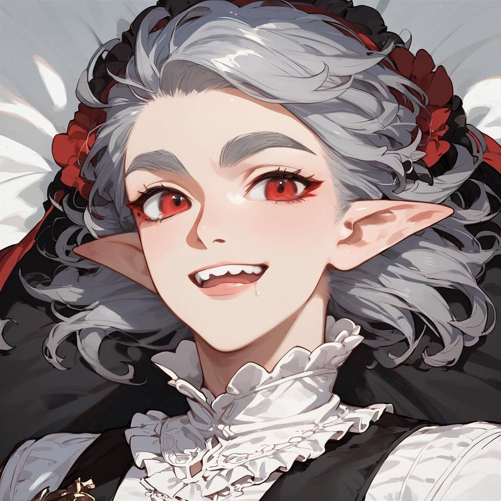 Score_9, score_8_up, score_7_up, score_6_up, score_5_up, score_4_up, source_anime, 1boy, solo, grey hair, grey eyebrows, red eyes, pointy ears, vampire, sharp teeth, bg3astarion, smirk, looking at viewer, ruffled white shirt