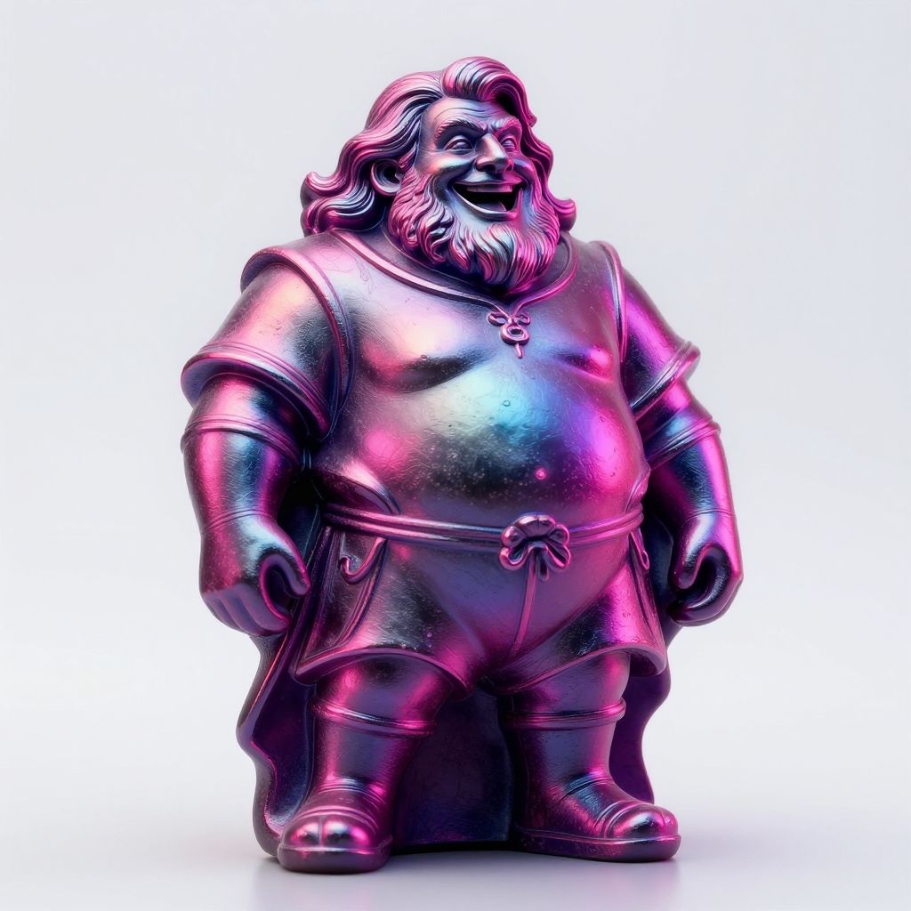 Photograph of a colorful, metallic sculpture depicting a jovial, bearded man with wavy hair, standing confidently. The figure is dressed in medieval-style armor with short sleeves, a belt, and a sash. The sculpture has a shiny, iridescent finish with hues of pink, purple, and blue, reflecting light across its surface. The man's expression is friendly, with a slight smile. The background is plain white, emphasizing the vibrant colors and detailed texture of the sculpture. The overall style is whimsical and playful, capturing a sense of medieval charm with modern, colorful flair.