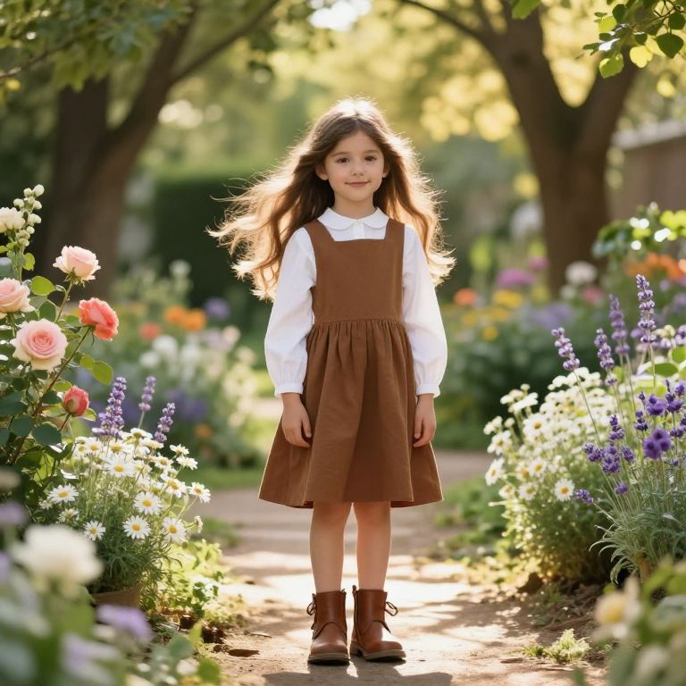 Photograph of a young girl standing on a sunlit garden path, surrounded by colorful blooming flowers. She has long, wavy brown hair, fair skin, and wears a white long-sleeve shirt under a brown pinafore dress with a gathered waist, and brown lace-up shoes. The garden features a variety of flowers including pink, purple, and white blooms, with tall trees in the background. Sunlight filters through the leaves, creating a warm, inviting atmosphere. The girl stands centered, looking directly at the camera with a gentle smile.