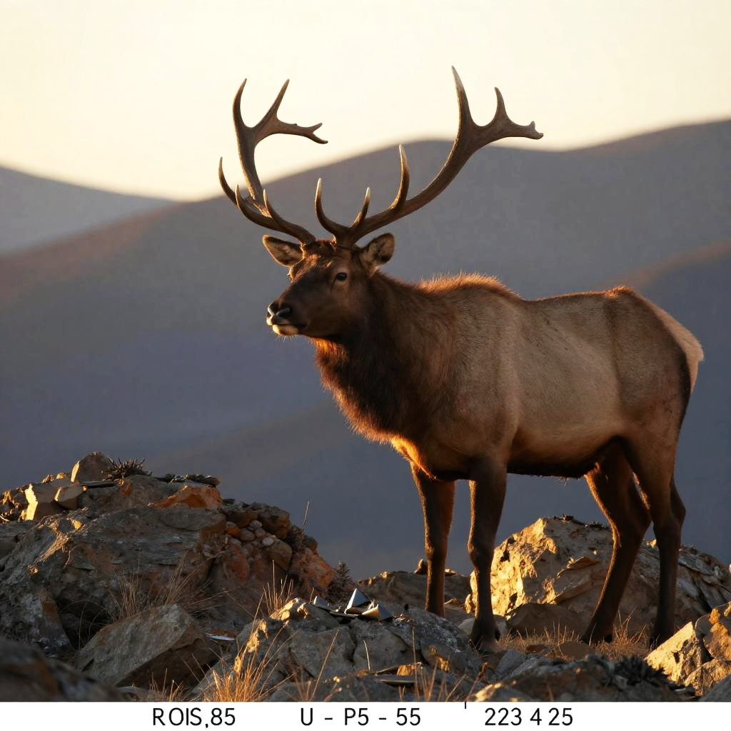 Trail cam footage of a majestic bull elk standing proudly on a rocky terrain during golden hour, mountains in the distance, warm sunlight illuminating its impressive antlers and textured coat, dramatic and immersive natural scene.