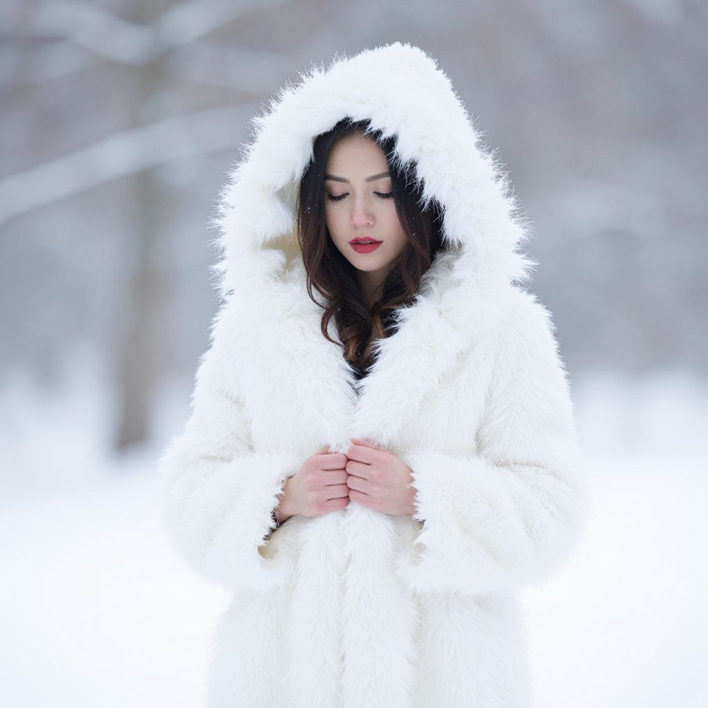 Photograph of a woman with long brown hair, wearing a white fur-trimmed winter coat with a hood, standing in a snowy forest. Snow