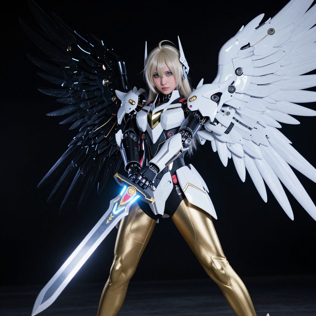 Digital art of a blonde, blue-eyed, armored angel with white and black wings, gold leggings, and glowing sword, standing against a black background.