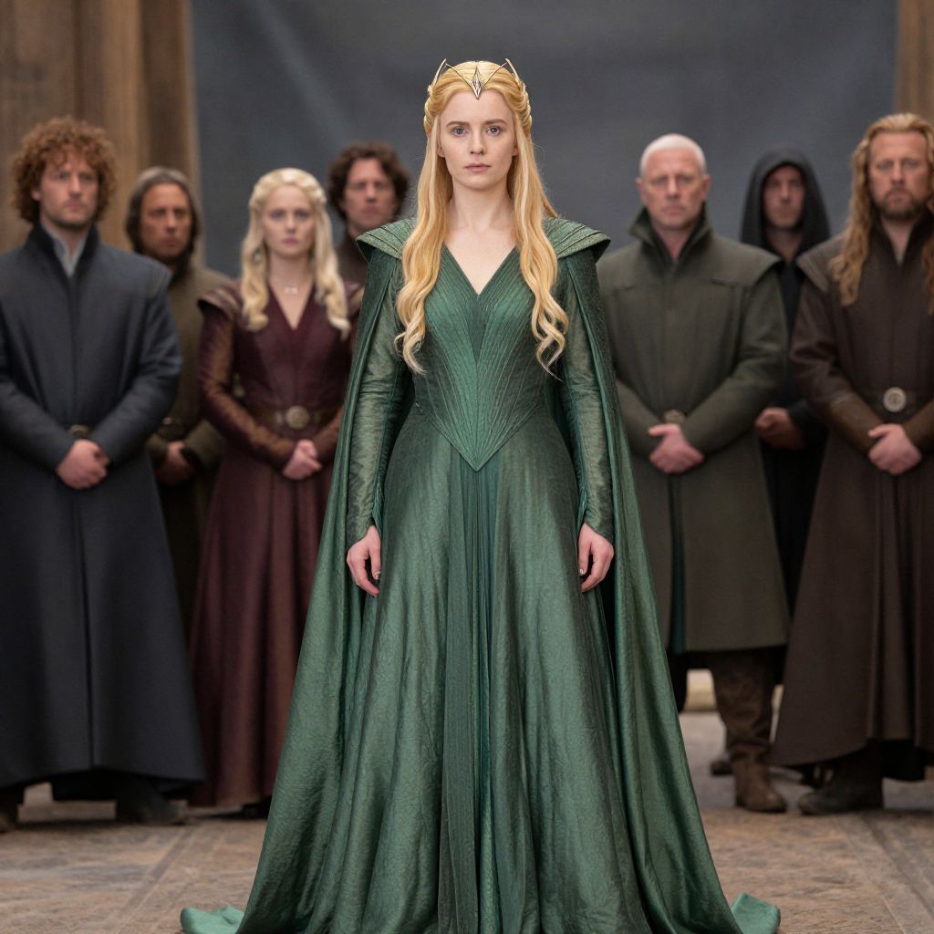 Lord the rings elf woman costume, a woman in a green dress and a crown standing in front of a group of people