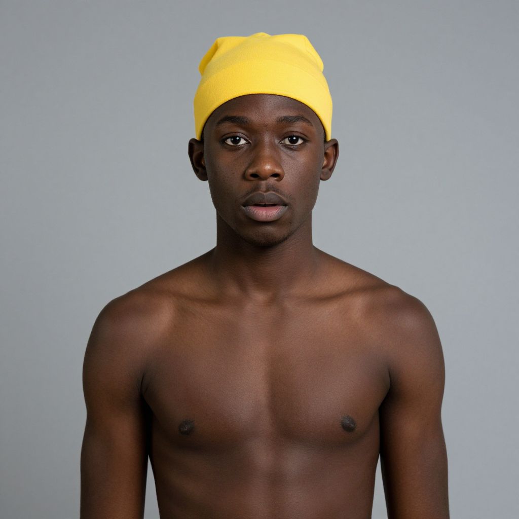 Golds gym clothing costume, 1boy, male focus, solo, looking at viewer, dark skin, upper body, grey background, yellow headwear, closed mouth, dark-skinned male, simple background, black eyes