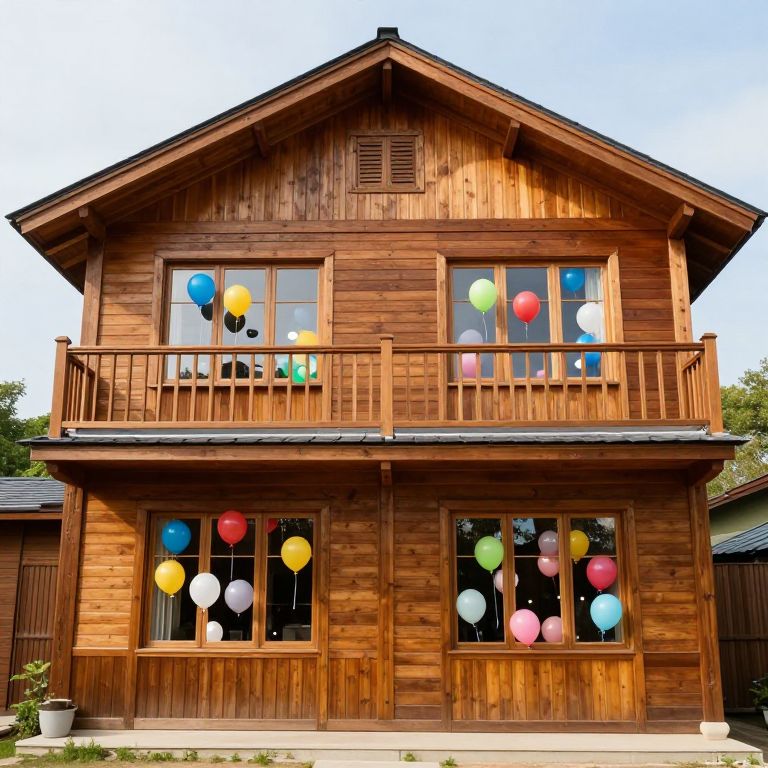 Photograph of a two-story wooden house with a gabled roof, showcasing a bright and cheerful exterior. The house features a wooden balcony on the second floor, adorned with colorful balloons in red, yellow, blue, green, and white, visible through the glass doors and windows. The lower level has two large windows with more balloons inside. The wooden walls have a warm, natural brown hue, with a small vent on the upper gable. The sky is clear and blue, and a hint of greenery is visible in the background. The house stands on a concrete foundation, with a small potted plant on the left side.