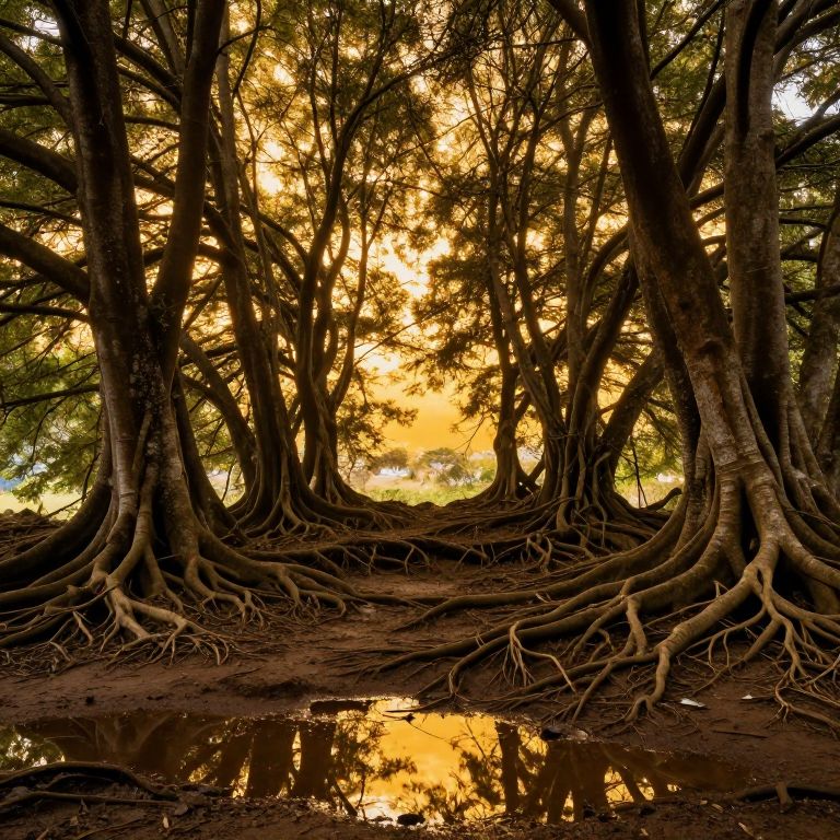 Photograph of tall, dense trees with thick, intertwining roots, reflected in a shallow puddle. Sunlight filters through leaves, creating a golden