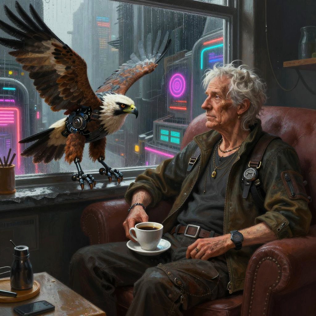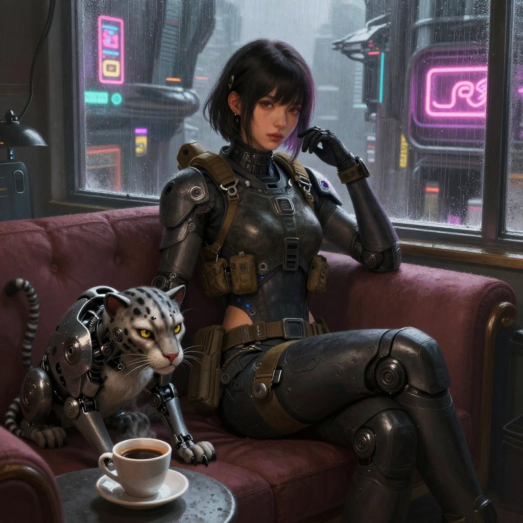 Cyberpunk Teen with Ferret and Coffee