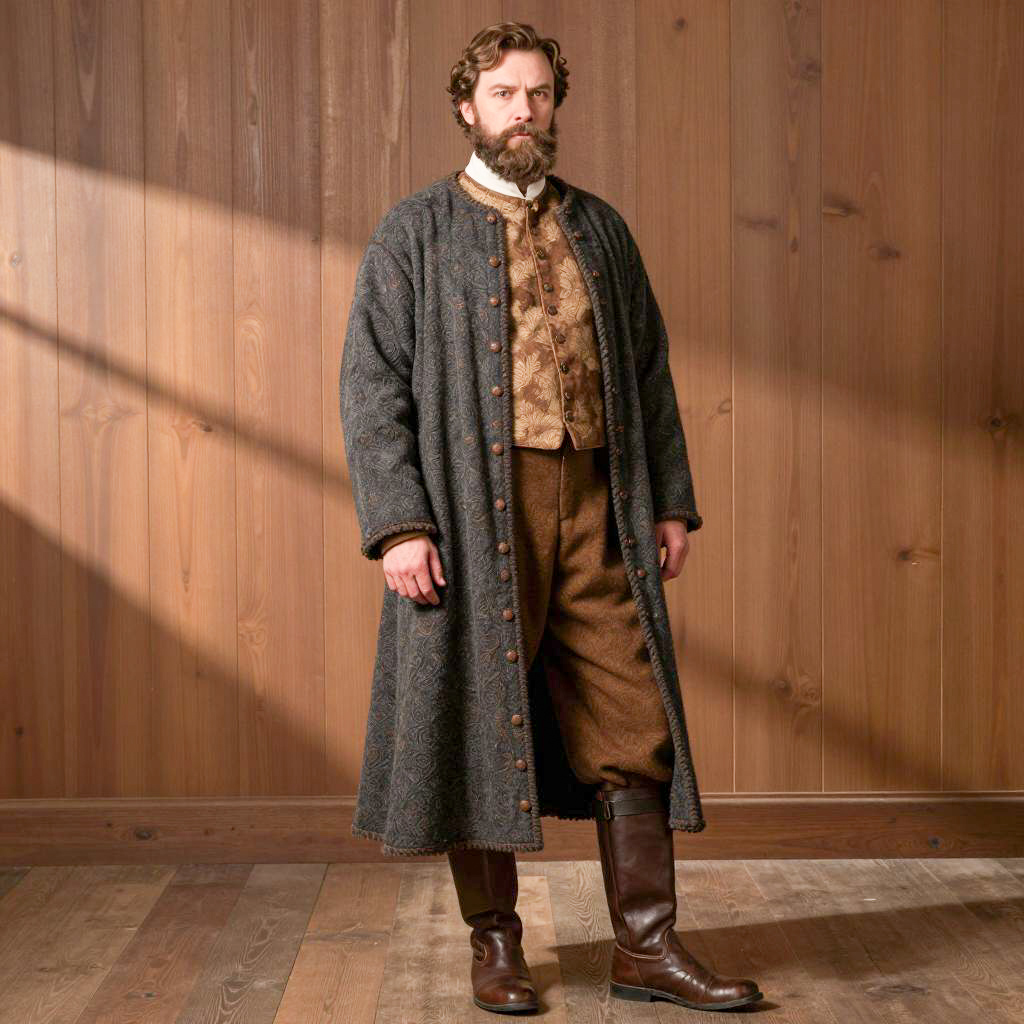Woolen clothes costume, photorealistic portrait, middle-aged man, standing, indoors, warm lighting, brown wooden wall background, long dark gray and brown patterned robe, brown and beige vest, brown pants, brown leather boots, dark brown beard, serious expression, sunlight casting shadow on wall, realistic ures, historical costume, standing with one foot slightly forward, hands resting on robe, soft shadows, muted colors, vintage style, historical reenactment