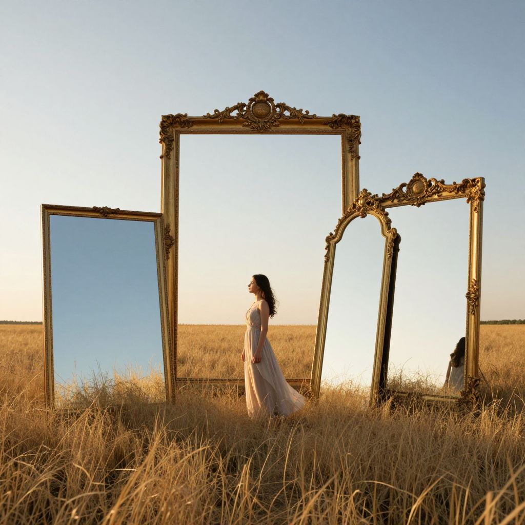 Whispering mirrors stand tall in a golden field, their ornate frames reflecting the sky as a woman in a flowing dress stands serenely before them, her gaze directed toward the horizon where reality meets imagination.