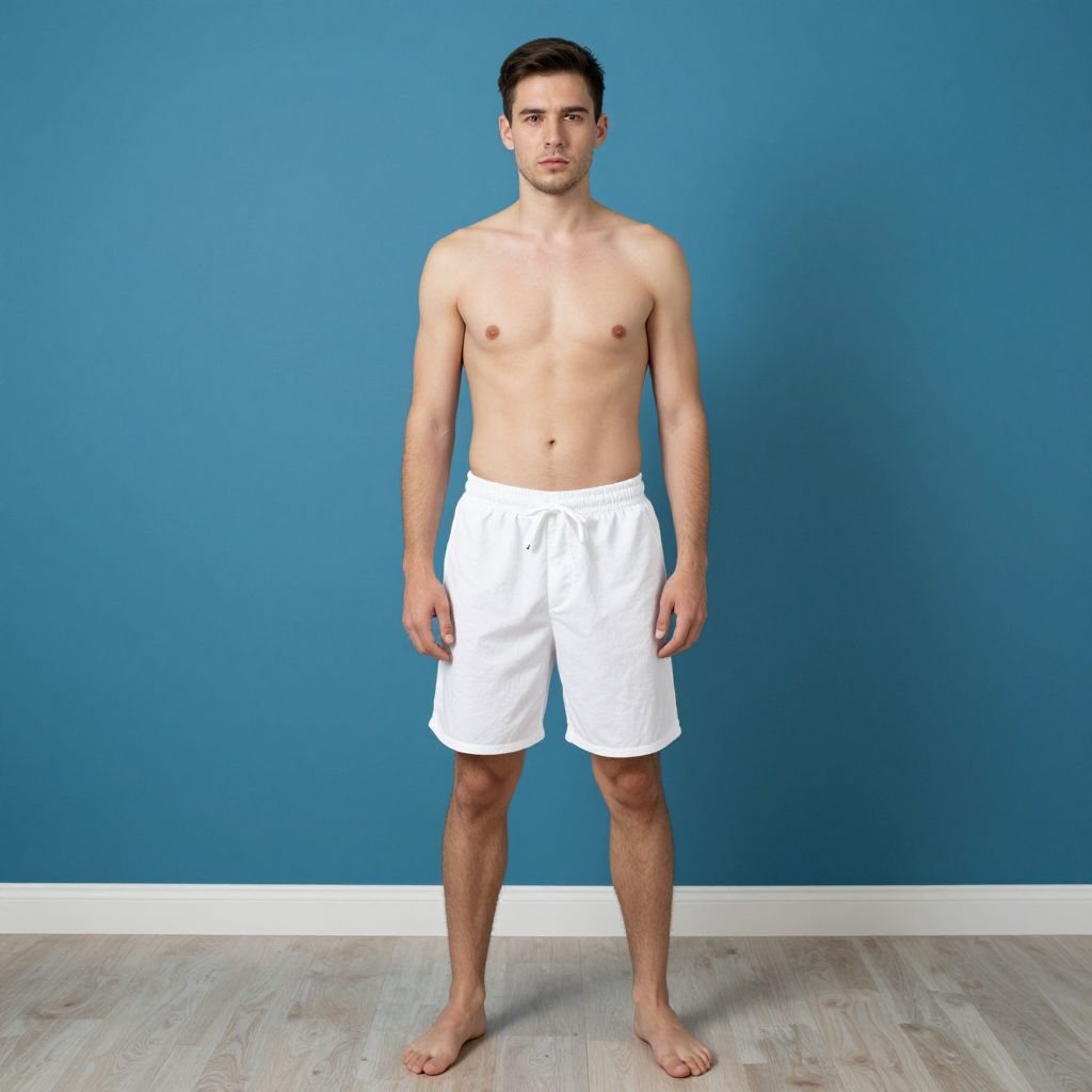White Shorts Man Outfit Costume, man in white shorts standing in a room with a blue wall
