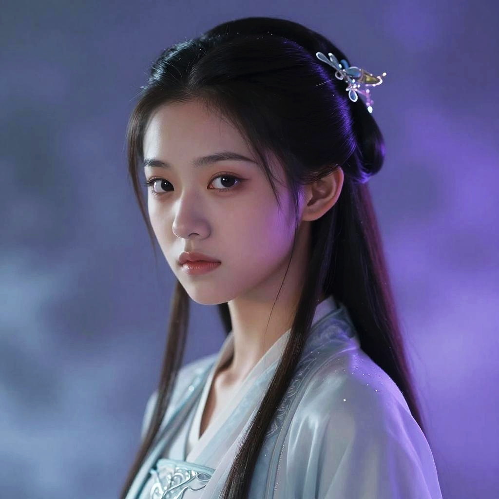 Photograph of an Asian woman with long black hair, wearing a white, high-collared, floral-patterned silk cheongsam, illuminated by