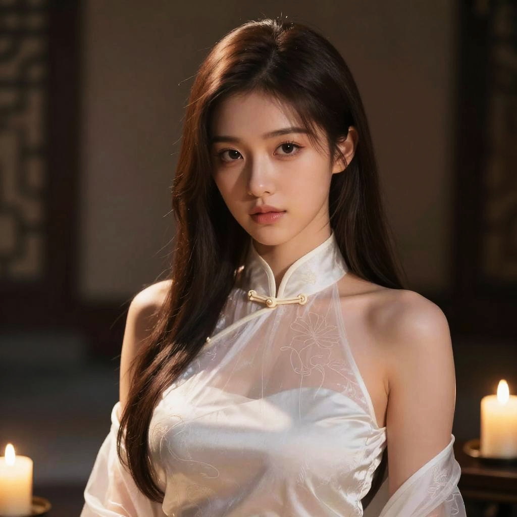 Photograph of an East Asian woman with long, straight black hair and fair skin, wearing a high-collared, white silk cheongsam with intricate floral embroidery. She has a calm expression and almond-shaped eyes. The background is dimly lit, featuring two candles on either side, casting a warm glow. The cheongsam's fabric is smooth and slightly reflective, contrasting with the dark, textured background. The scene exudes a traditional, elegant atmosphere.