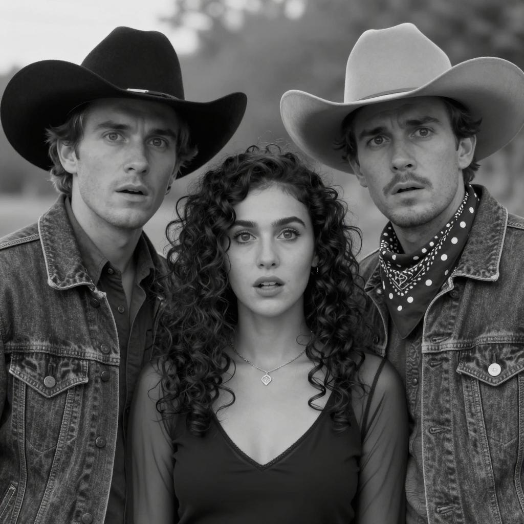 Three people stand outdoors at sunset. Center: muscular man with curly blond hair, white tank top, bruised forehead, serious expression. Left: young woman with long brown hair, white blouse, neutral expression. Right: young man with cap, blue tank top, serious expression. Trees and clear sky in background.
