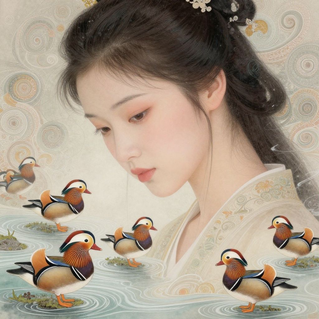 Digital artwork featuring a serene Asian woman with fair skin and delicate, traditional Chinese-style hair adorned with white flowers. She has soft, downcast eyes and wears an ornate, cream-colored robe with intricate patterns. Surrounding her are several vividly colored Mandarin ducks, characterized by their orange heads, black and white striped bodies, and yellow beaks. The ducks are depicted in various poses on a water surface with gentle ripples, creating a tranquil, ethereal atmosphere. The background is a blend of soft, swirling patterns in pastel hues, enhancing the dreamlike quality of the image.