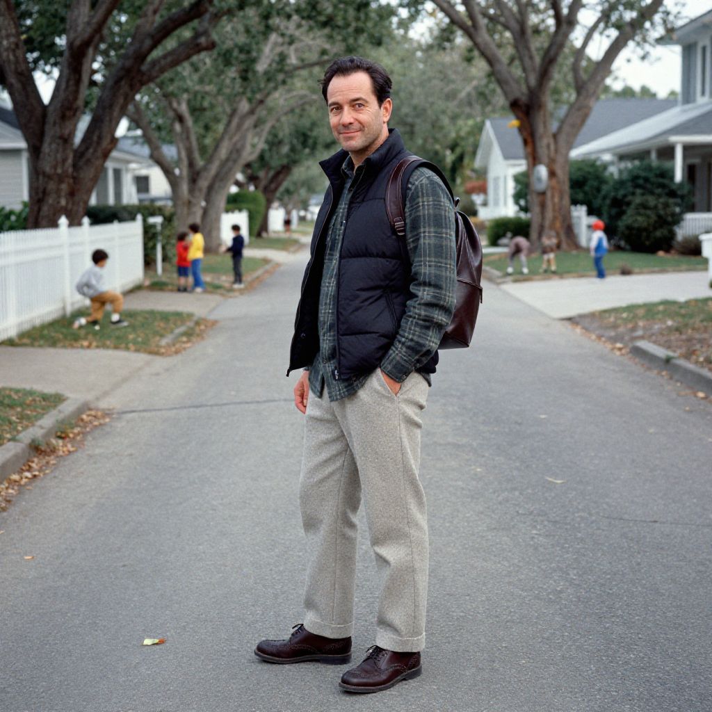 A man, thermal shirt in navy blue, insulated pants in charcoal gray, rugged leather boots, casual fit, perfect for outdoor activities, tree-lined streets, vintage brick houses, children playing in front yards, Cibachrome style, relaxed smile, enjoying the moment. Man has masculine face and piercing eyes