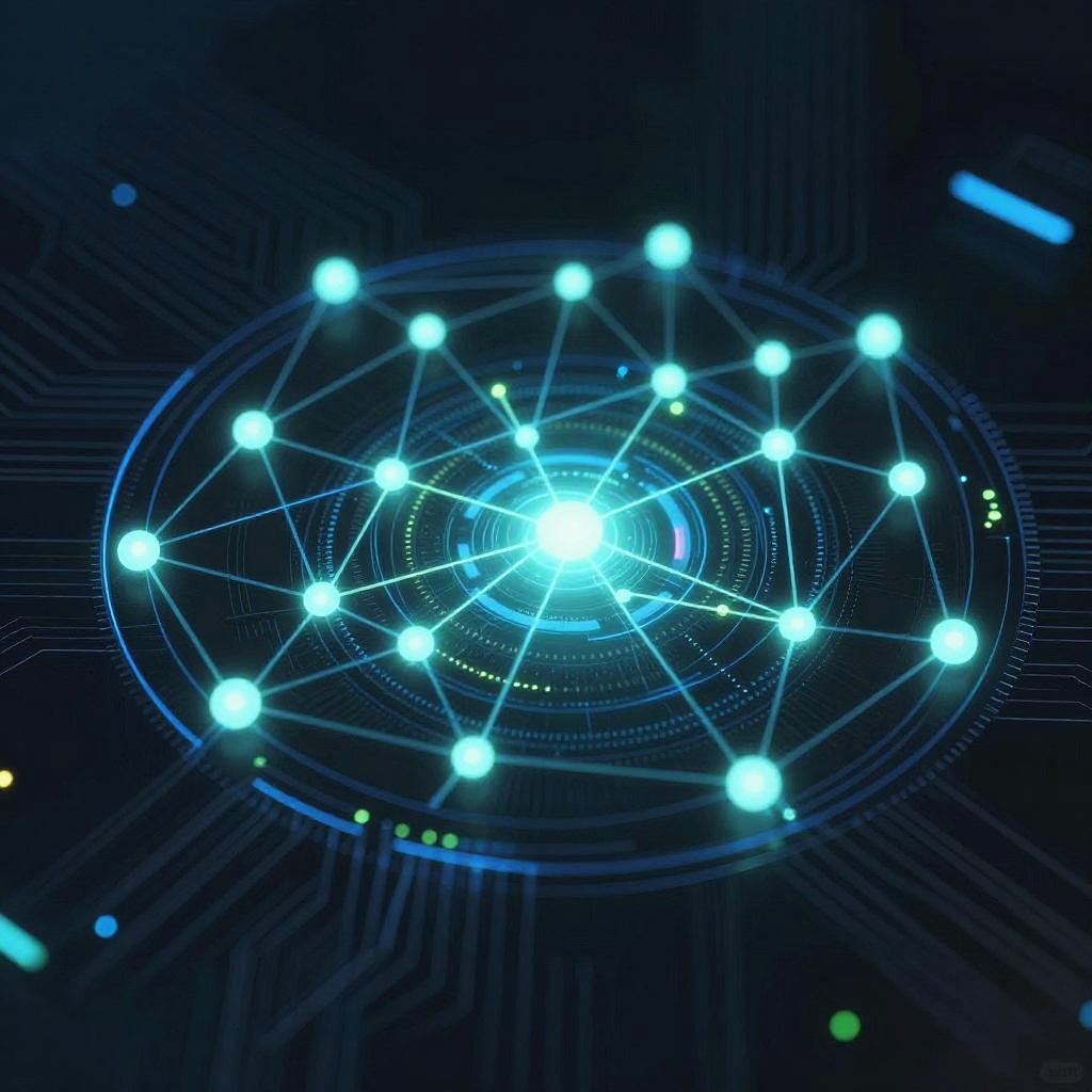 Outline generator picture displaying a complex network of glowing lines and nodes, futuristic digital interface style with neon blue and green highlights, high detail, dark background with subtle circuit patterns, tech-inspired cyberpunk aesthetic.
