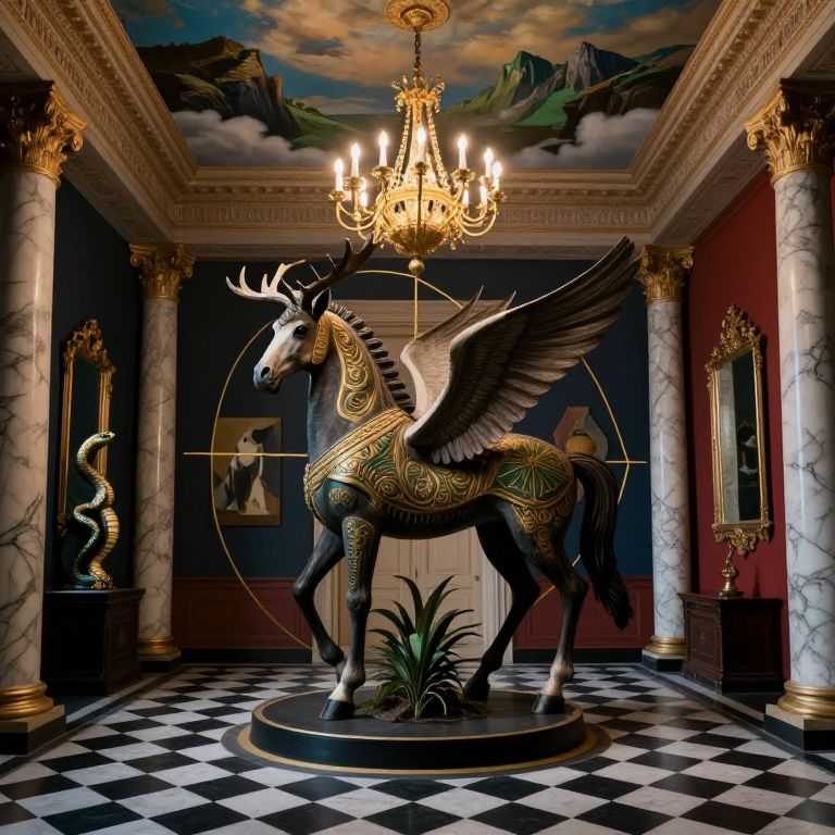 The image depicts a surreal and fantastical scene set within a room with a checkered floor and marble columns. Dominating the center is a Pegasus with a cyclops head, moose horns, and wings, standing on a circular platform with a plant. The Pegasus is adorned with intricate gold and green patterns, evoking a sense of opulence and otherworldliness. Above the Pegasus, a golden chandelier hangs from the ceiling, casting a warm glow over the scene. The walls are adorned with various artworks and a mirror, reflecting the room's grandeur. A statue of a snake with marble columns adds to the room's architectural complexity. The ceiling features a painting of green mountains, creating a sense of depth and perspective. The overall composition is balanced, with the Pegasus centrally positioned, surrounded by geometric shapes and a golden ratio, enhancing the sense of harmony and mathematical precision. The room's atmosphere is one of melancholy and introspection, with clouds below the ceiling and a sense of sadness and loneliness permeating the scene. The colors are rich and varied, with black, red, and blue hues dominating the palette, adding to the surreal and dreamlike quality of the image.