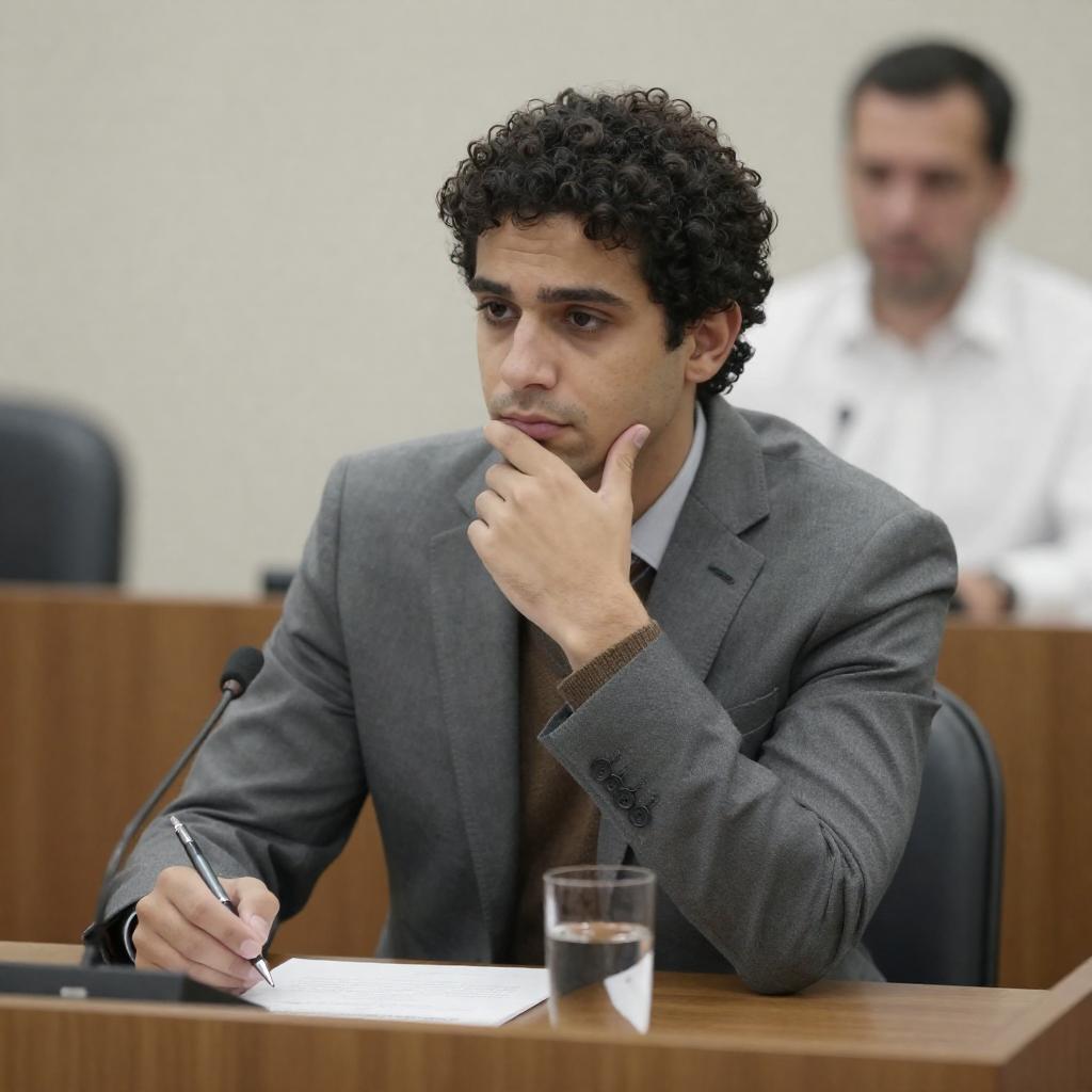 Photograph of a man with curly dark hair, wearing a gray suit and brown sweater, sitting at a wooden table in a courtroom. He holds a pen in his right hand, resting his chin on his left hand, looking thoughtful. A blurred man in a white shirt is in the background. A microphone and glass are on the table.