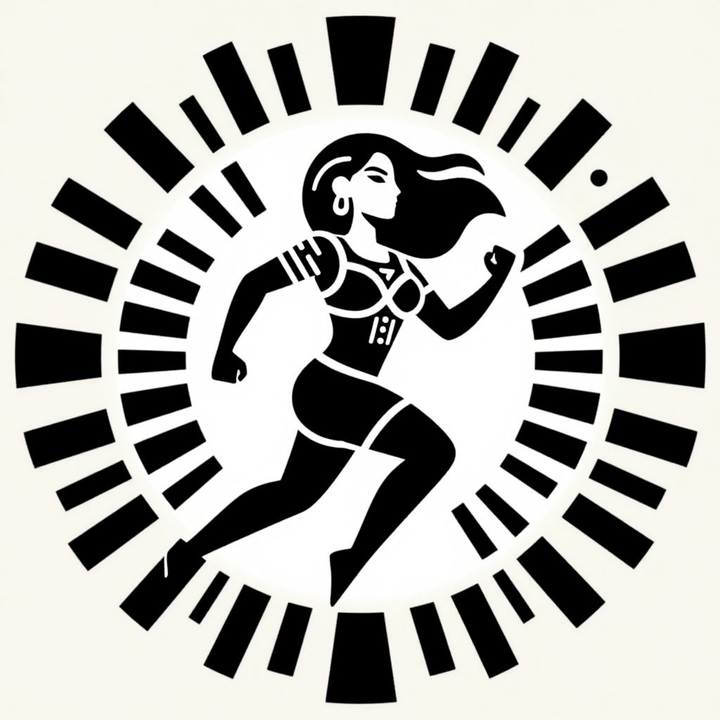 The image presents a striking graphic icon of an energetic woman, reminiscent of a Mayan hieroglyph. The central figure is a stylized, dynamic female figure with flowing, wavy hair, depicted in a dynamic pose that conveys movement and vitality. She is adorned in a revealing outfit that accentuates her form, with a bra and shorts, and her body is adorned with intricate, geometric patterns that add to the hieroglyphic feel. The background features a circular, sunburst-like design with radial lines emanating from the center, creating a sense of radiance and energy. The color palette is limited to black and white, with the woman and her attire in black against a white background, while the sunburst and surrounding elements are in black against a light beige backdrop. The overall composition is balanced, with the woman centrally positioned and the sunburst encircling her, creating a harmonious and visually engaging image.