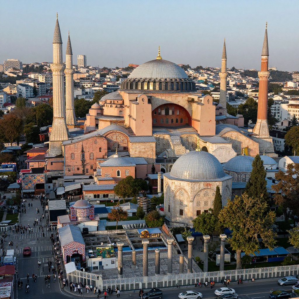 Photograph of Istanbul's Hagia Sophia, showcasing its iconic domes and minarets, surrounded by densely packed buildings under a clear blue sky.