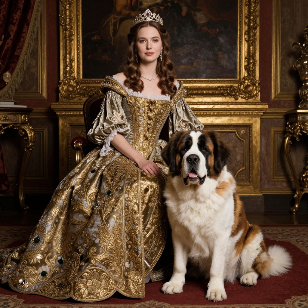 This elegant image features a woman in a luxurious gown, posing gracefully alongside a Saint Bernard dog. The opulent setting is adorned with golden accents and rich textiles, highlighting a regal atmosphere reminiscent of classic portraiture.