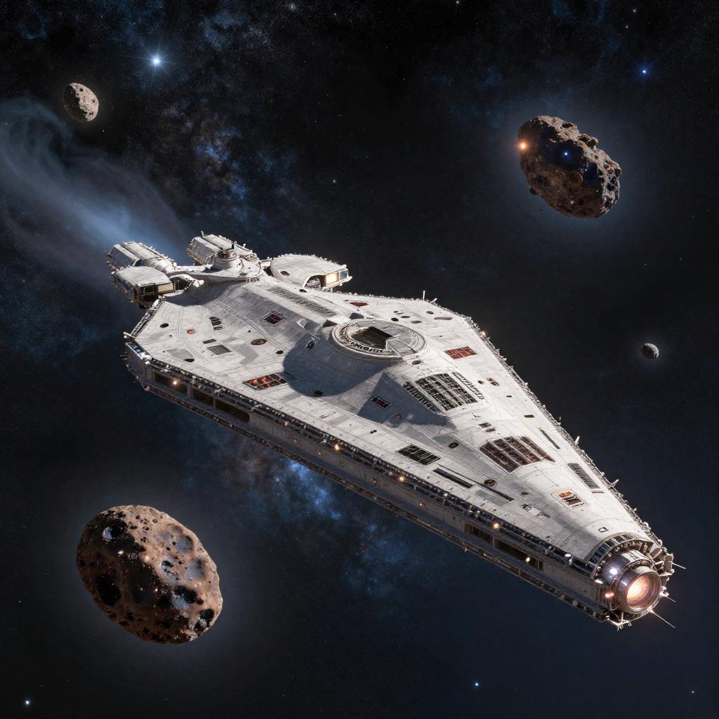 Starship background set against a vast starfield, a colossal starship navigating through asteroid belts, glowing cosmic dust, intricate spaceship design under a panorama of glowing stars