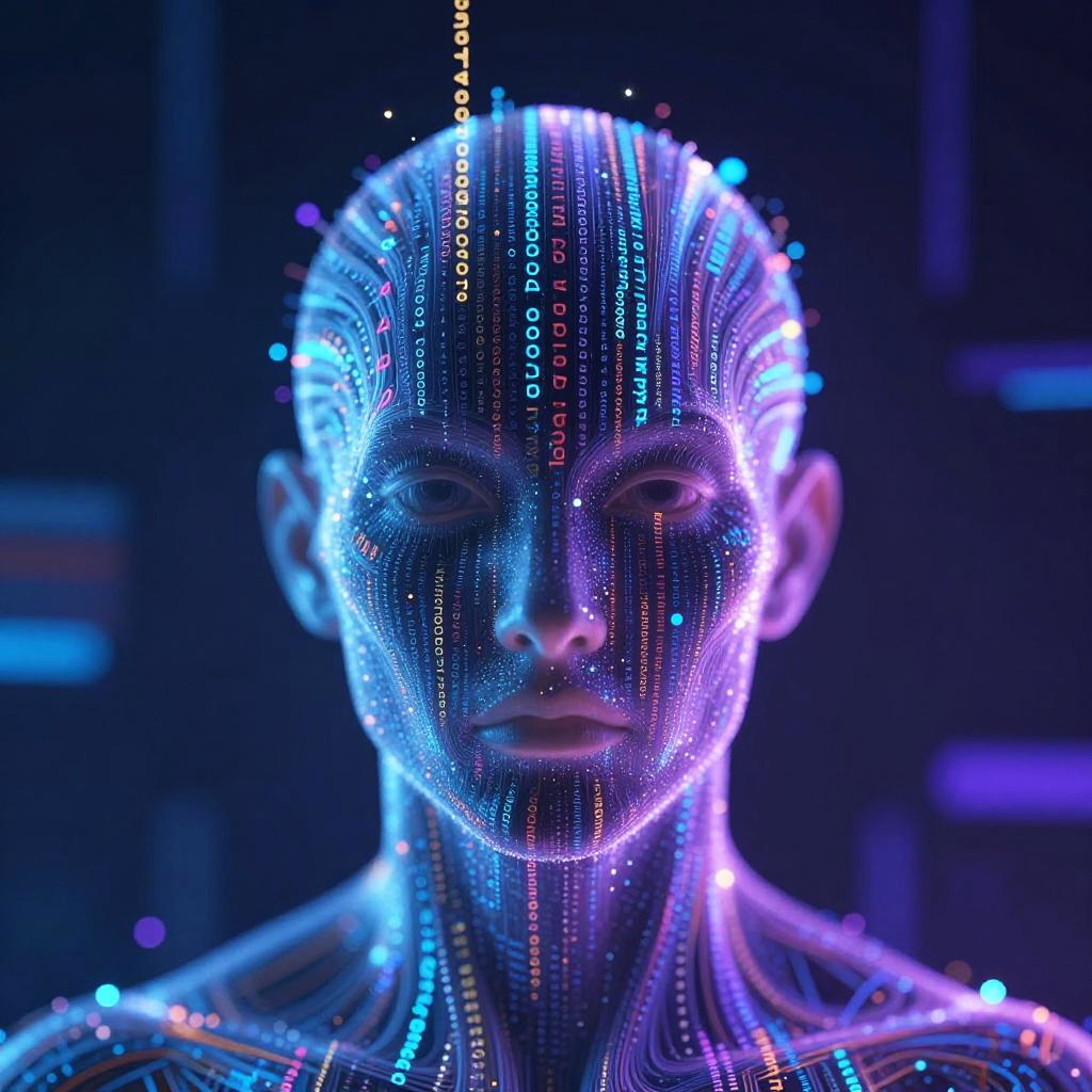 Abstract visualization of text to avatar generation, flowing streams of colorful code and letters morphing into a detailed human face avatar, luminous particles, digital art style, cybernetic aesthetic, deep blues and purples, immersive virtual reality background