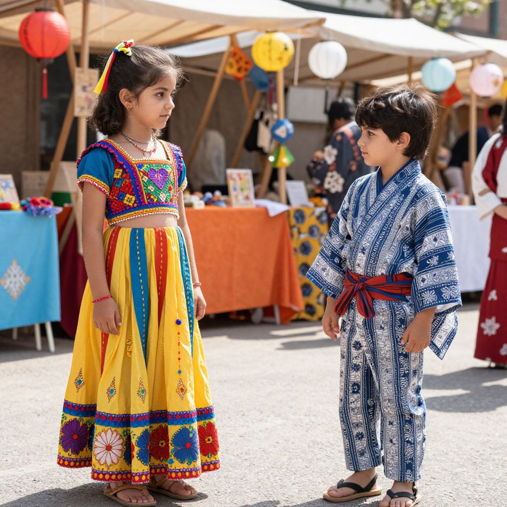 A realistic photo shoot of children in handmade and traditional children's dress clothes and costumes for a cultural festival, featuring a girl in a traditional Indian saree-style dress with bright embroidery and a boy in a Japanese kimono-inspired costume, set in a sunny outdoor market with colorful stalls and lanterns.