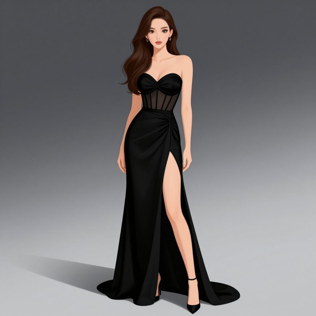 Digital illustration of a slender, fair-skinned woman with long, wavy brown hair. She is wearing a strapless, black, form-fitting evening gown with a high slit on her right leg, revealing her left leg. The gown has a sweetheart neckline and is adorned with subtle vertical seams. She stands confidently, wearing black high-heeled shoes. The background is a gradient from dark blue at the top to white at the bottom, with a soft shadow beneath her. Her red lipstick contrasts with her elegant attire.