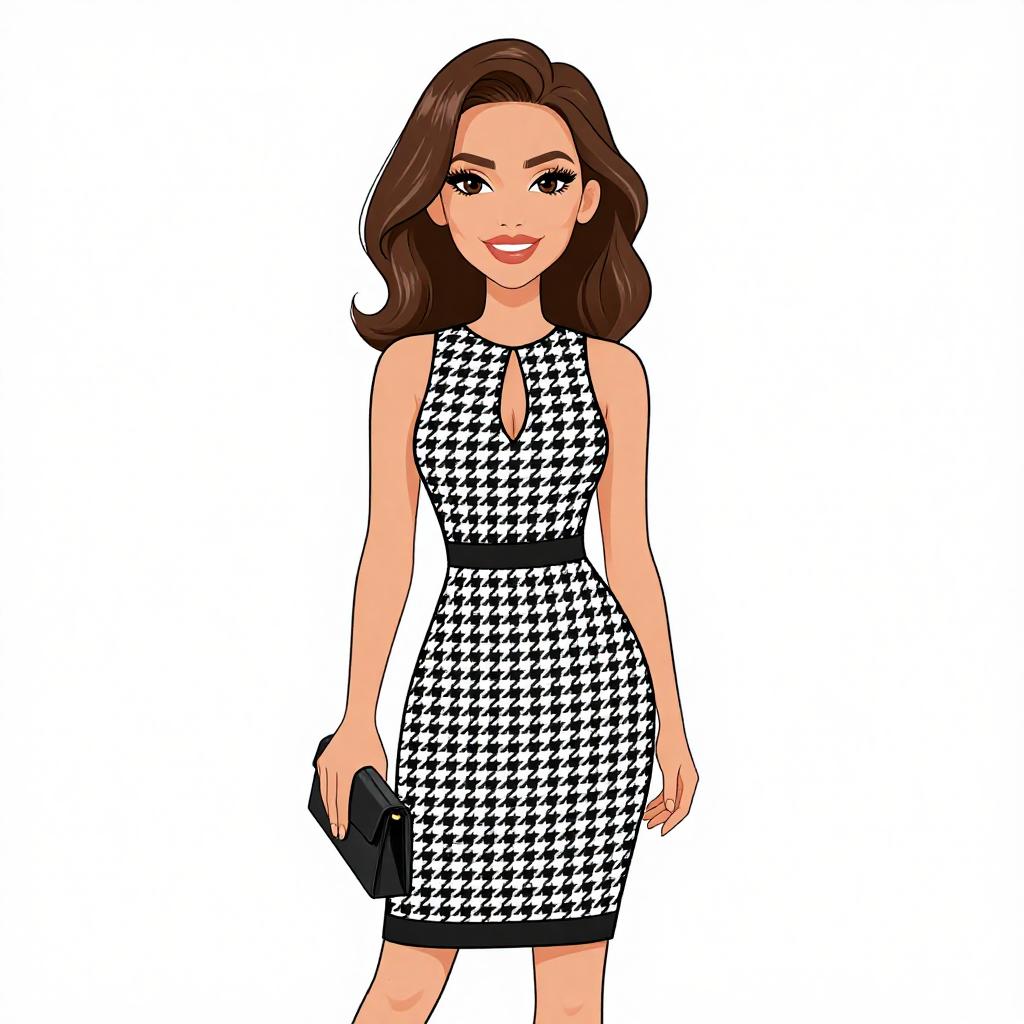 Woman with pretty face and pretty hair. smiling Woman, chic, black long-sleeve crop top, high-waisted pencil skirt with white vertical and horizontal stripes, red high-heeled sandals, shoulder bag with chain strap. --sref 1467