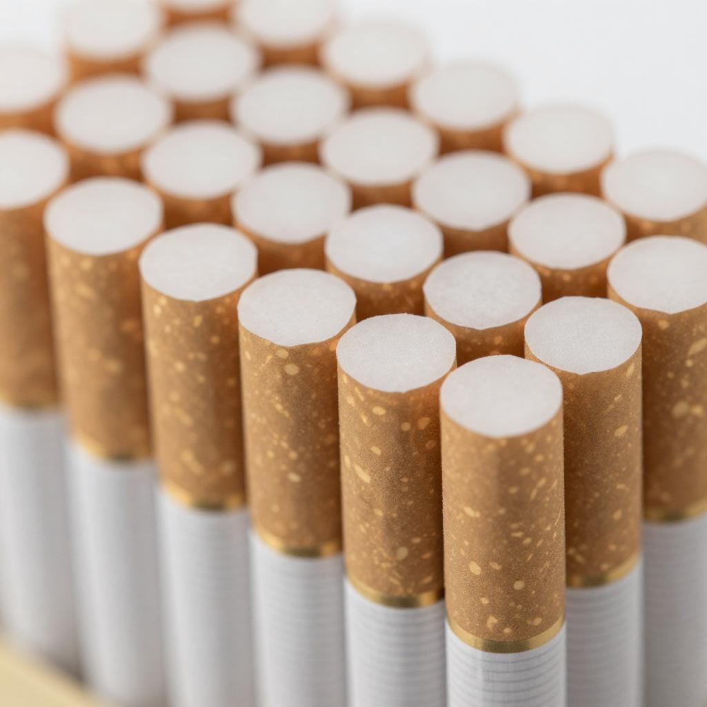 Macro shot of a tightly packed group of cigarettes showing the brown filters with white tips, arranged in an orderly fashion. The image focuses on the texture and repetitive pattern of the cigarette filters, with a blurred background emphasizing the depth of field.