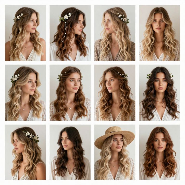 This is a photograph collage of twelve headshots of a woman with wavy, long hair in various styles and colors. The woman has fair skin and is wearing a white, lace V-neck top. Her hair, displayed in both brunette and blonde shades, is adorned with white floral crowns in some images. She wears a straw hat in one image. The background is plain white, highlighting her hair and facial features. The images are arranged in a 3x4 grid, showcasing different angles and expressions, emphasizing the natural, beachy, and bohemian aesthetics of her hairstyles.