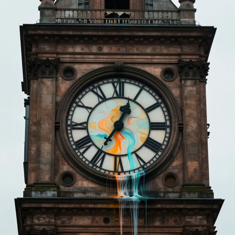 Time dissolves into liquid hues within the ancient clock tower, its ever-shifting colors and currents inviting contemplation of eternity's fluid embrace, while the faint echo of dripping water whispers the passage of moments.