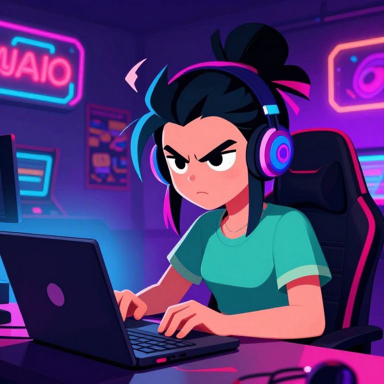 Digital illustration of an annoyed girl with black hair in a bun, wearing headphones, green shirt, typing on a laptop in a neon-lit gaming room