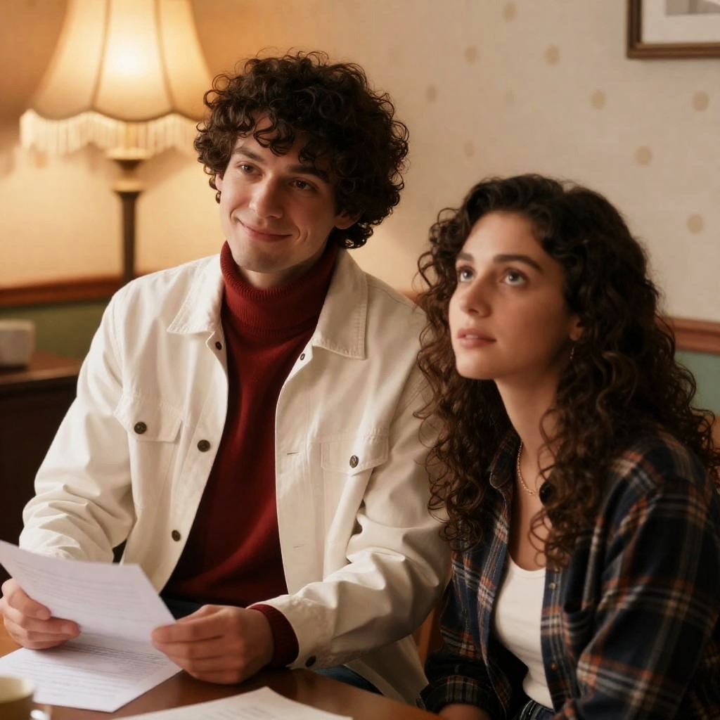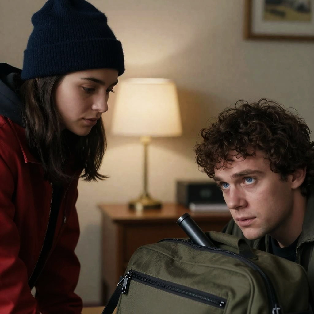 Indoor photograph of a young woman with dark hair wearing a red jacket and navy beanie looking down intently, next to a young man with curly brown hair and blue eyes peeking over a green bag with a gun barrel visible. A lamp on a wooden table is in the softly lit background.