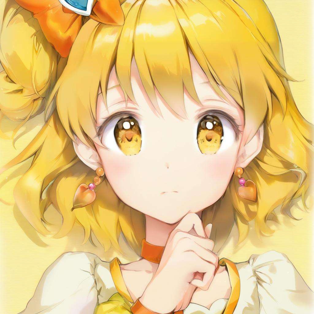Cure pine, precure, 1girl, yellow eyes, brown eyes, short hair, blonde hair, heart hair ornament, hair bow, orange choker, earrings, magical girl, one side up, magical girl, wrist cuffs, by artist anmi, leet