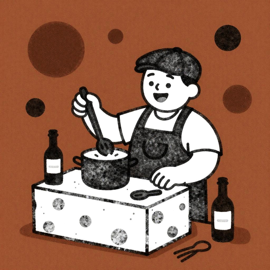A grainy charcoal print featuring a jovial cheesemaker in a flat cap working at a simple counter, black-and-white character with a friendly smile, holding a long spoon over a steaming pot; scattered utensils and a labeled bottle on the table. The background is a rich burnt sienna poster field for bold contrast. Playful abstract shapes, flat lighting, chunky lines, minimal perspective, tactile print grain, spirited, whimsical.