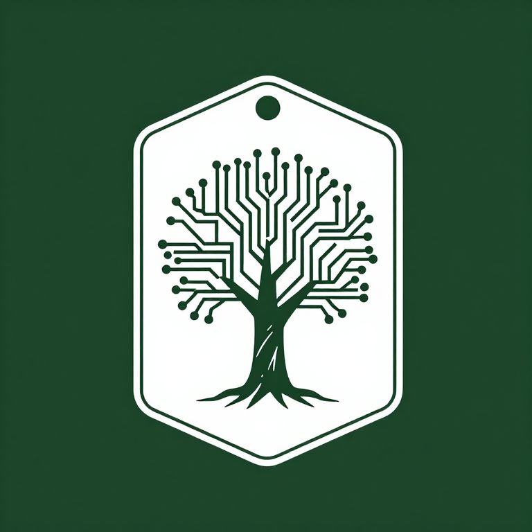 A minimalist logo design featuring a tree made of circuits, with green monochrome ink art and a badge-like frame.