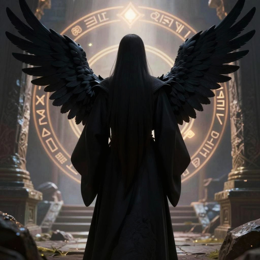 Anime black wings folded gracefully behind a mysterious figure cloaked in black robes, ancient ruins in the background, soft glowing runes, ethereal and mystical atmosphere, detailed textures
