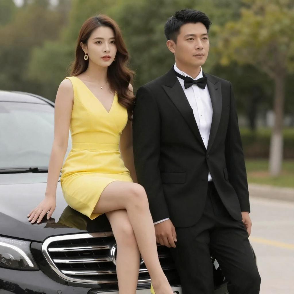 Photograph of three young Asian adults dressed in formal attire, posing with a red convertible car. The man driving the car wears a gray suit, white shirt, and black sunglasses, smiling while seated. The woman passenger is dressed in a white blouse, black sunglasses, and smiling. Another man in a black suit, white shirt, and black sunglasses stands behind the car. The image captures bright daylight with a plain concrete wall background.